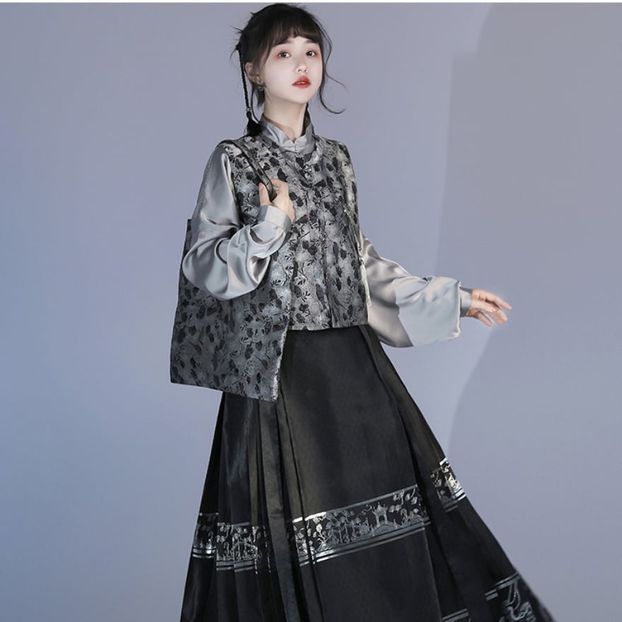 個性的なチャイナ風のベストに光沢感がおしゃれなグレー長袖シャツ、プリーツロングスカートの3点セット割りのオールインワンです。