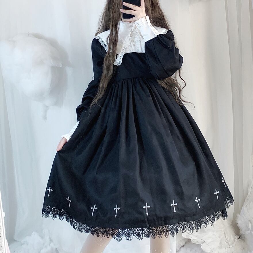 サブカル 服 地雷系 通販 ロリータ 梦梦の工作室シリーズ ワンピ つけ襟 クロス 十字架 刺繍 ゴスロリ 魔女