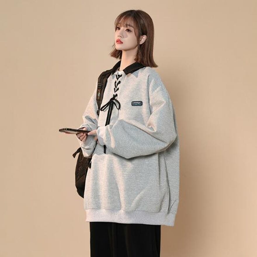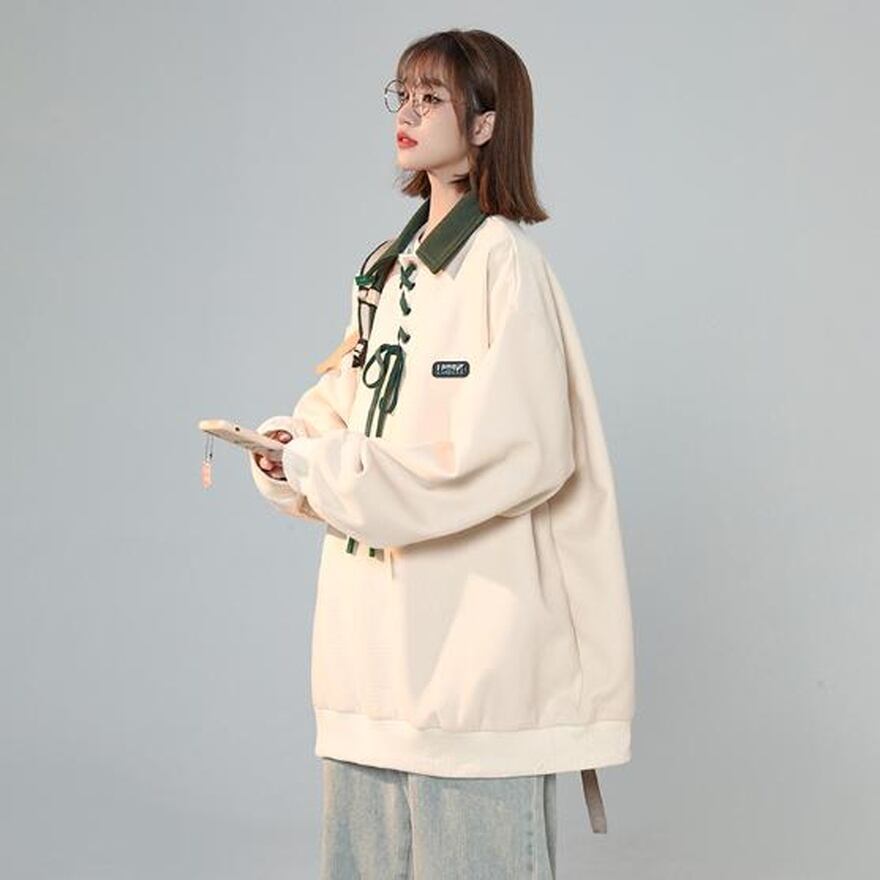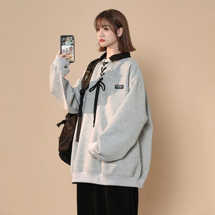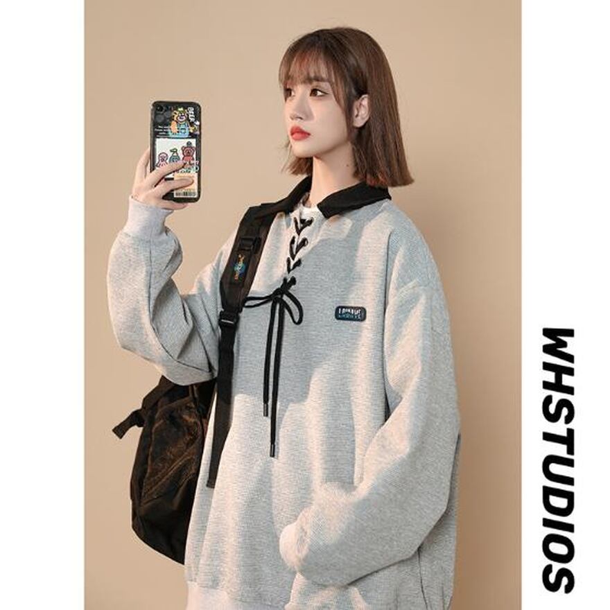 サブカル 服 地雷系 通販 春 POLOシャツ レースアップ カレッジスタイル ユニセックス カップルコーデ 普段着使い 韓国ファッション