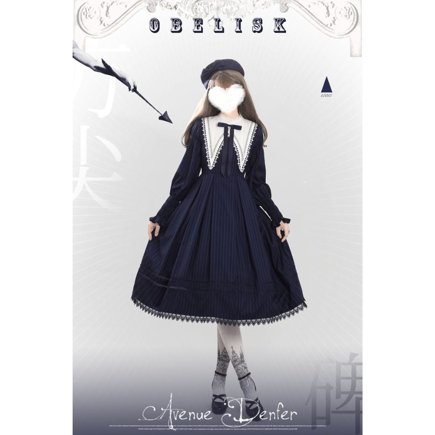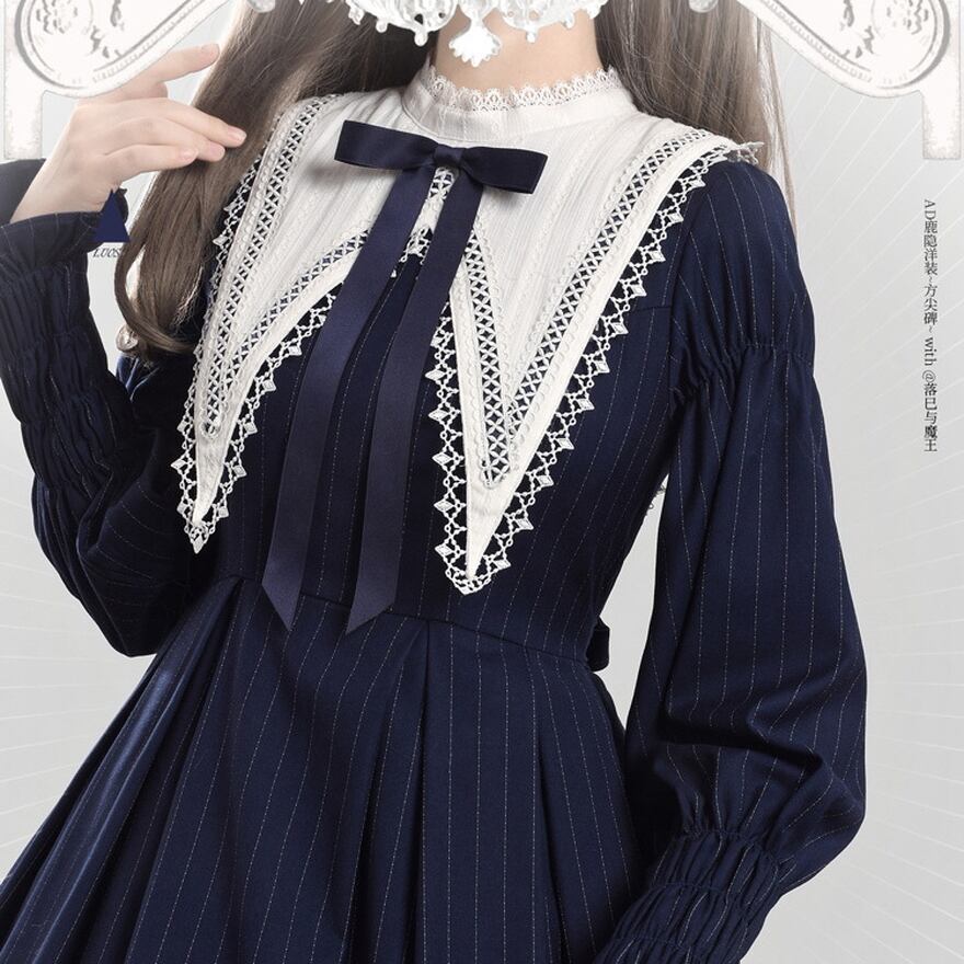 サブカル 服 地雷系 通販 ロリータ ワンピース ミドル丈 レトロ クラシカル ノスタルジック つけ襟付き ピンストライプ柄 控えめ