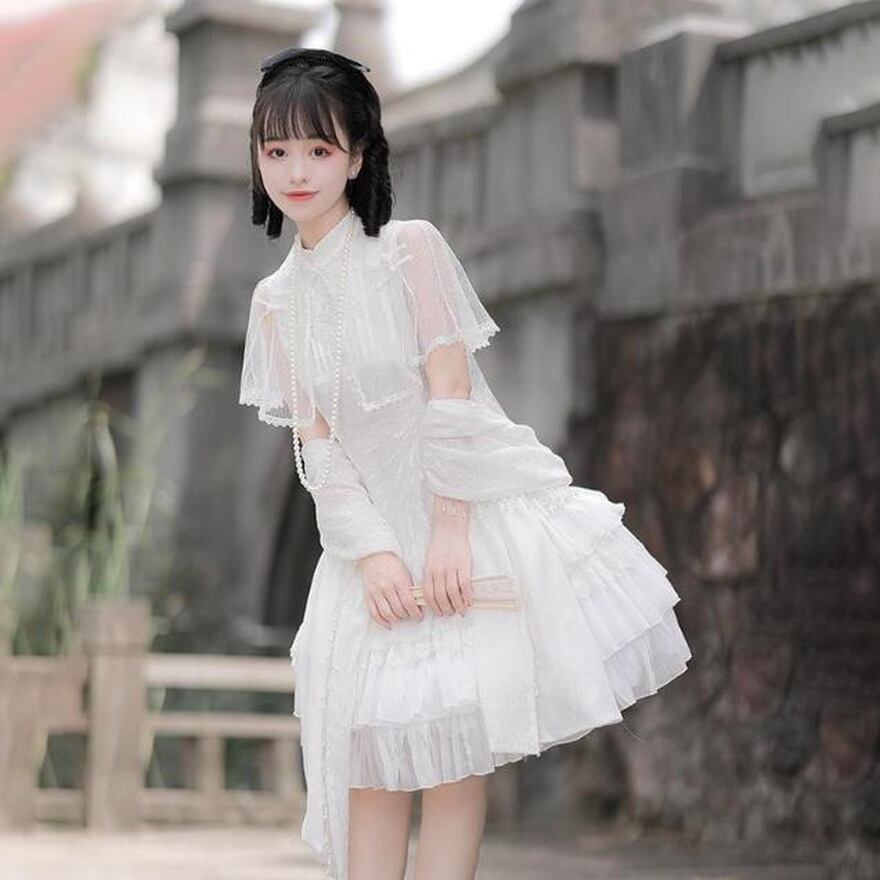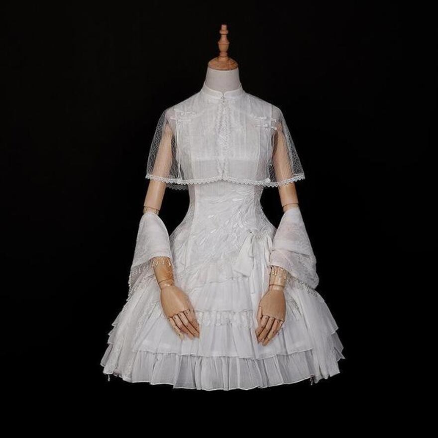 サブカル 服 地雷系 通販 チャイナ風 オールインワン 3点セット ワンピース ノースリーブ ショール ボレロ 立ち襟 ホワイトロリータ ロマンティック ゆめかわ おしゃれ増し