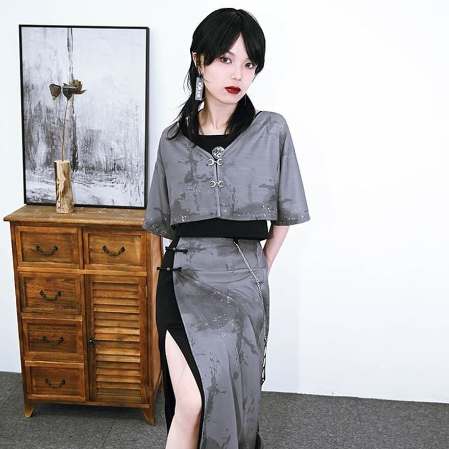 サブカル 服 地雷系 通販 チャイナ風服 チャイナ風服 古怪舎 スリットスカート ロング丈 バイカラーチャイナ服 チャイナ風服 チャイナボタン レトロ 普段使い