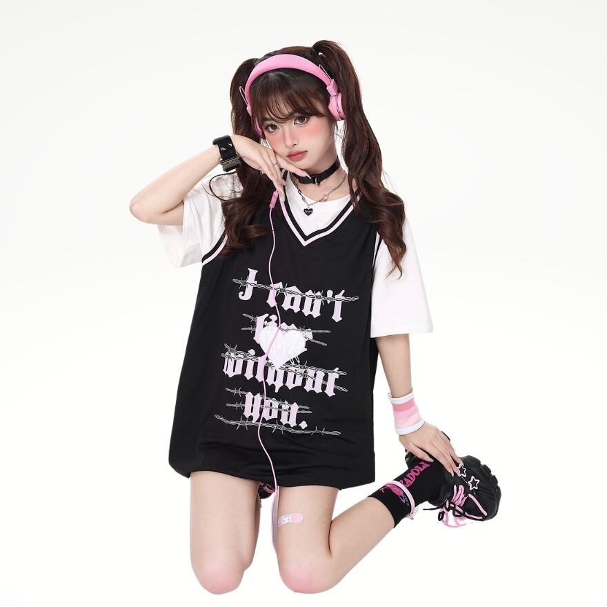サブカル 服 地雷系 通販 CRAZYGIRL ノースリーブ オーバーサイズ V字ネック プリント ロゴ JKファッション かわいい ガーリー