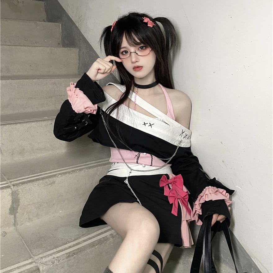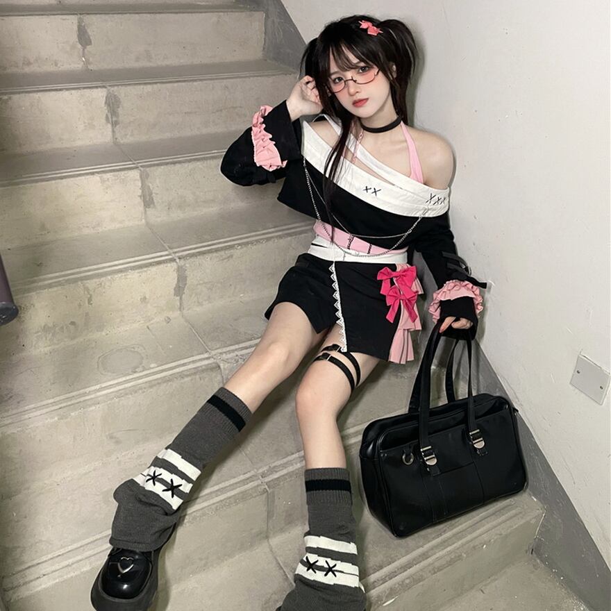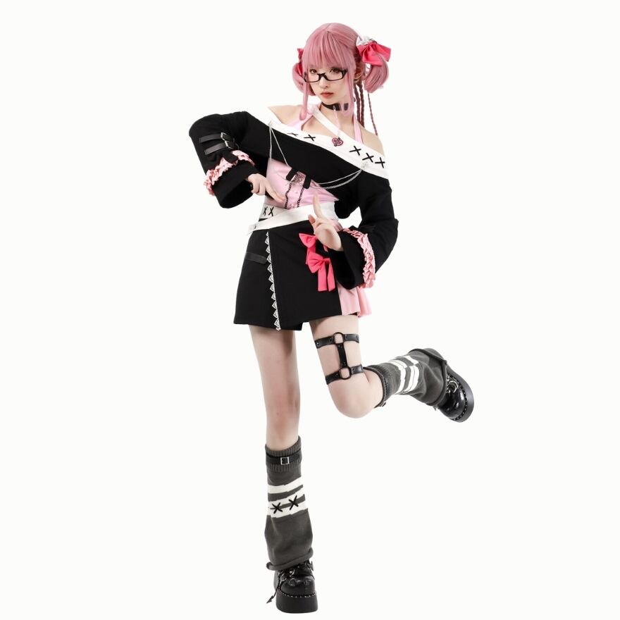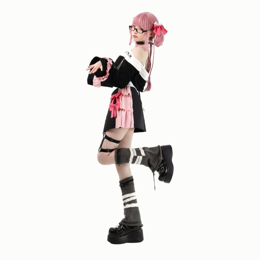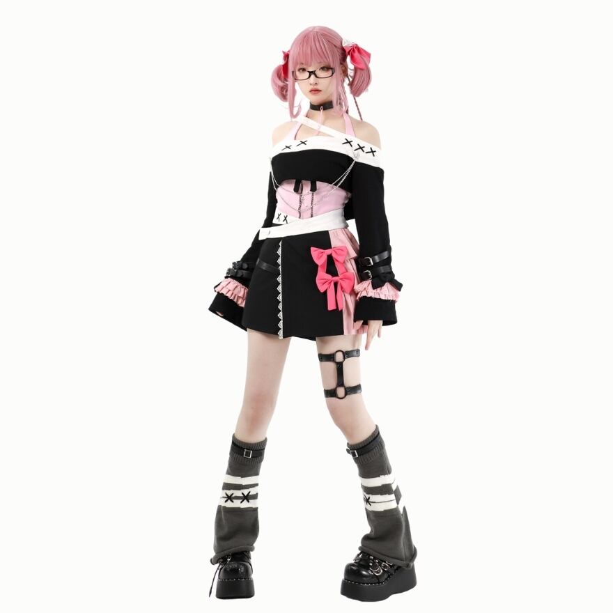 トレンドのブラック×ピンクのバイカラーに大きなサイドリボンが可愛いらしいミニスカに仕上がっています。