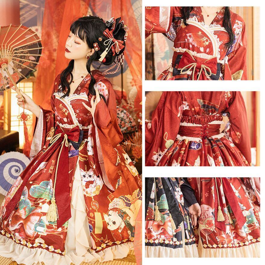 サブカル 服 地雷系 通販 サブカルファッション 和ロリ 和装 ワンピース 艶やか 豪華絢爛 花魁風 ワインレッド ブラック ガーリー