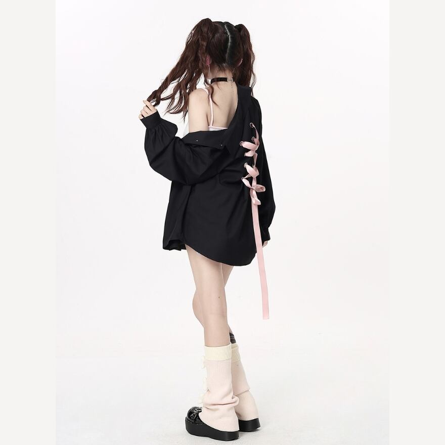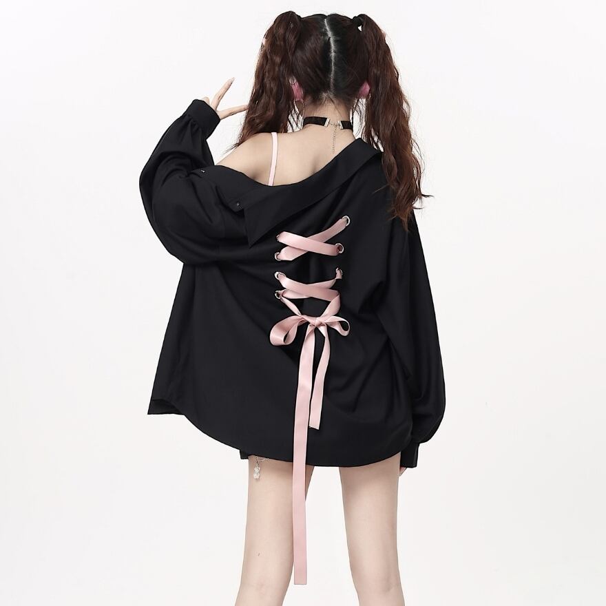 サブカル 服 地雷系 通販 CRAZYGIRL シャツ ロング ショート丈 オーバーサイズ バックリボン リボンカラー4本付属 JKファッション かわいい ガーリー服