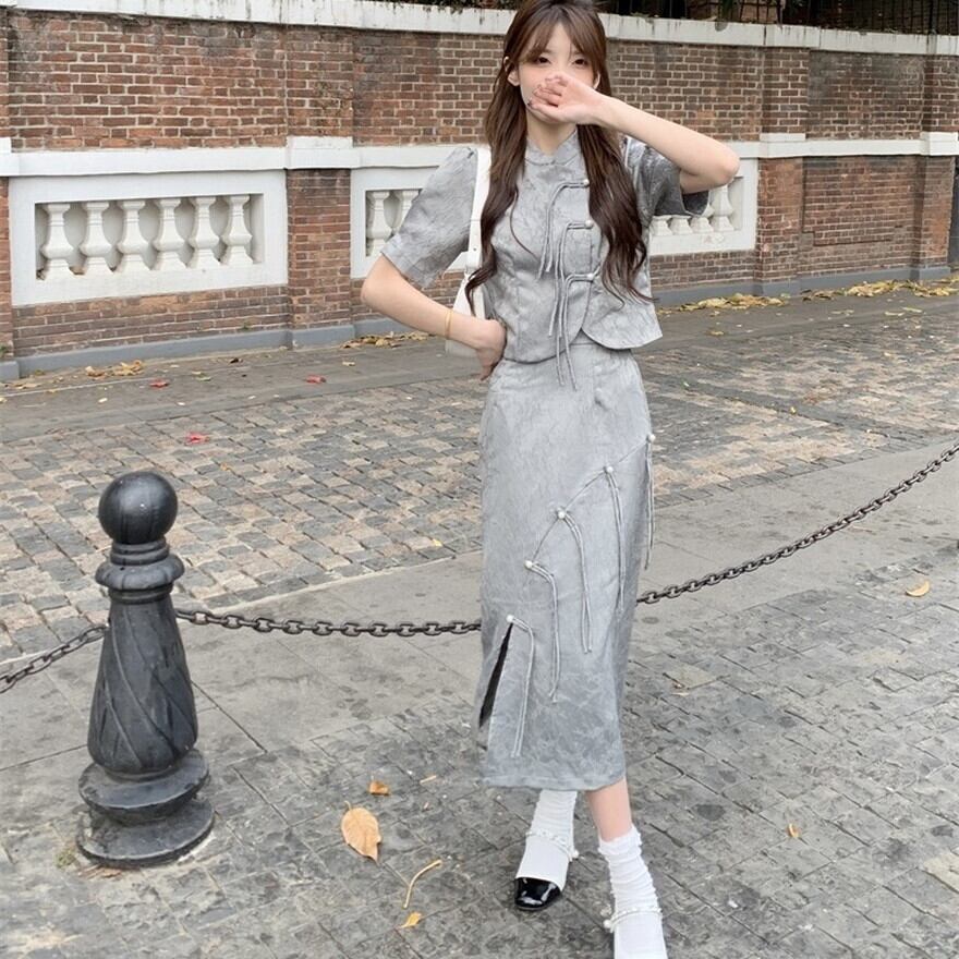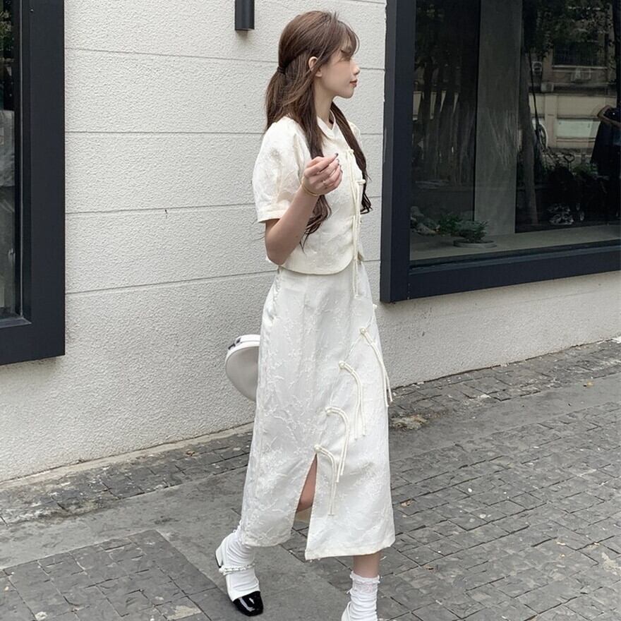 チャイナ服らしい立ち襟の半袖シャツにハイウエストロング丈のスカートの上下セットです。