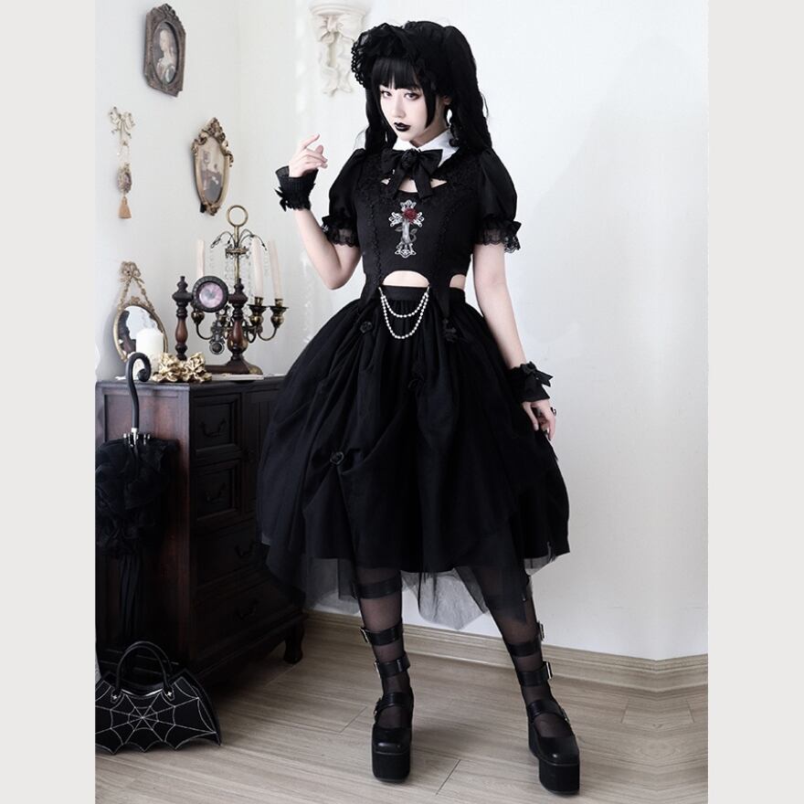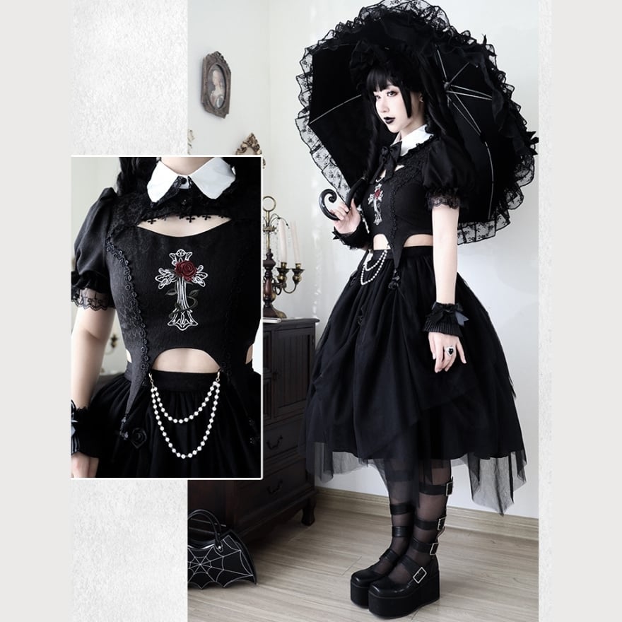 サブカル 服 地雷系 通販 セットアップ レース 刺繍 十字架 薔薇 フェイクパール 闇かわいい 暗黒 ゴシック