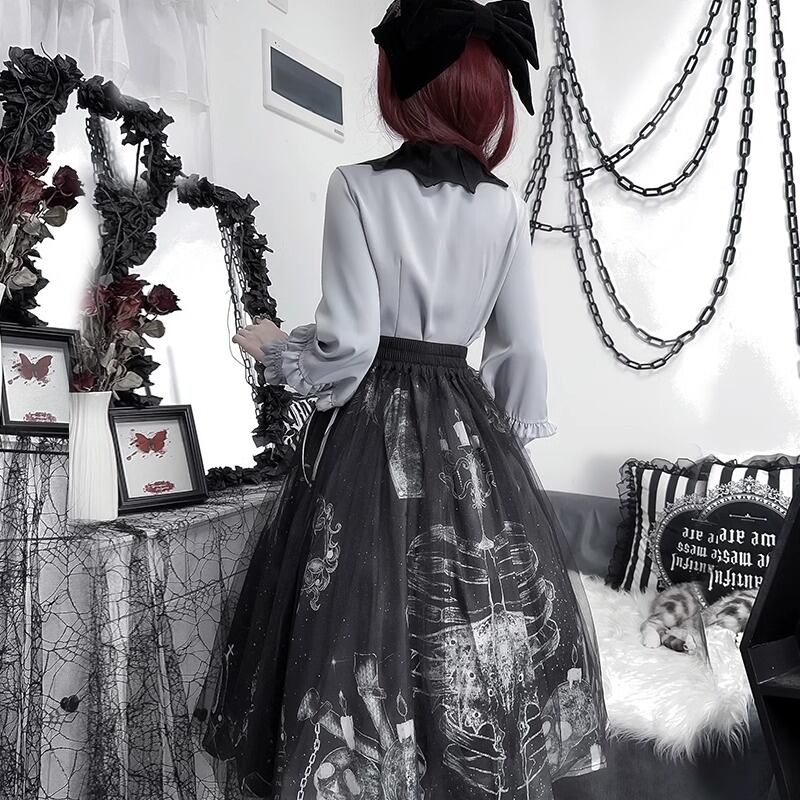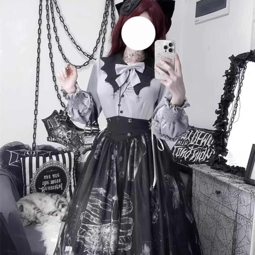 サブカル 服 地雷系 通販 セットアップ ブラウス スカート ミドル丈 スカル プリント柄 闇かわいい ゴシック