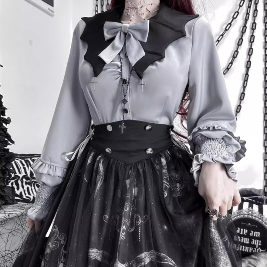蝙蝠をモチーフにした上品なブラウスとスカル柄スカートのセットアップです。