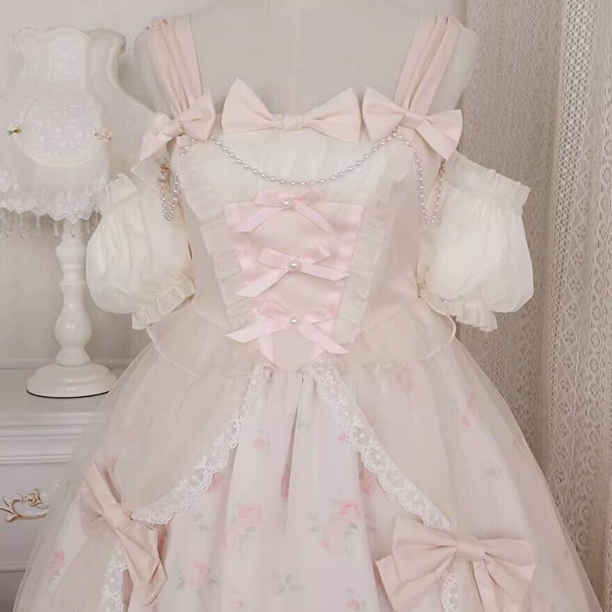 フェミニンで可愛らしい花柄デザインのJSKです。リボンやフリル、レースが豊富に使われ、プリンセスラインのシルエットが美しく、クラシカルでロマンティックな装いを演出してくれます。