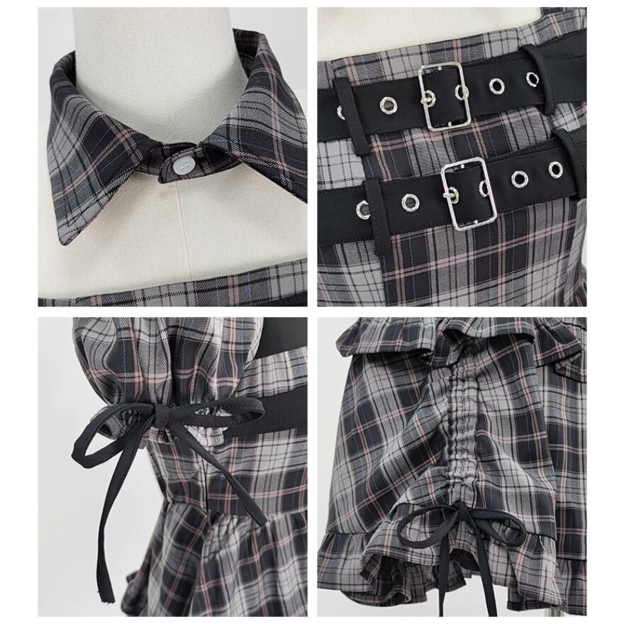 サブカル 服 地雷系 通販 Catwish ワンピ 半袖 パフスリーブ チェック柄 フリル ストラップベルト 闇かわいい ソフトロリータ JK量産型