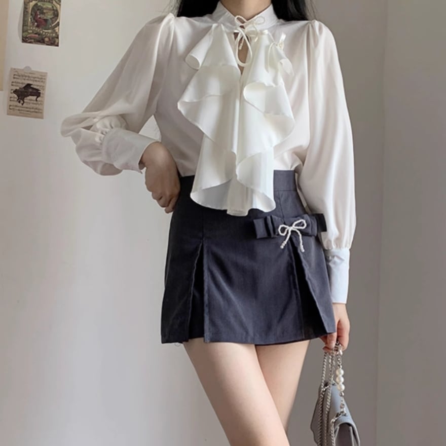 大人かわいいフリル使いの長袖ブラウスです。