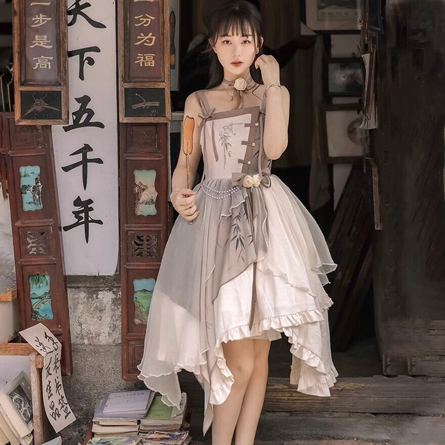 サブカル 服 地雷系 通販 華ロリ チャイナ風 ドレス レース レイヤード アシンメトリー 刺繍 クラシカル フリル リボン ガーリー かわいい 系