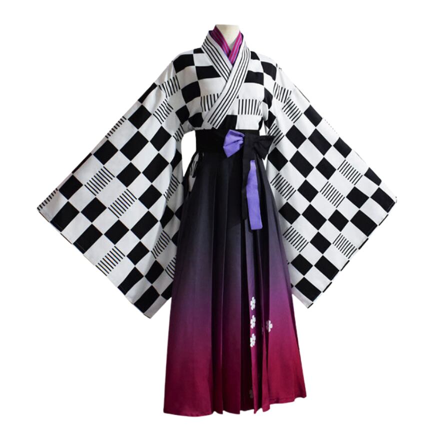 クラシカルな市松模様の着物上着にパープルのグラデーションが高見えするプリーツスカートの上下セットです。