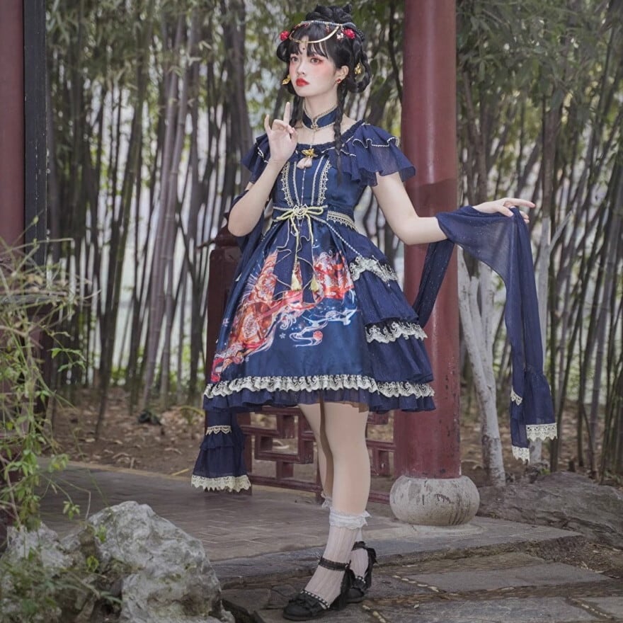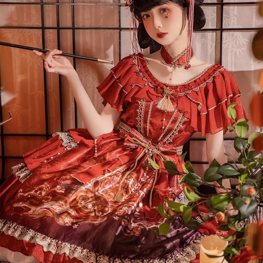 サブカル 服 地雷系 通販 華ロリ セットアップ ワンピ ボレロ チャイナ風 ウエストリボン 華やか 甘め ロマンティック