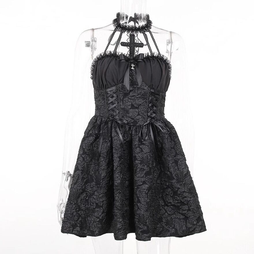 クロス十字にネックのチョーカーが病み可愛いゴシックなパンクスタイルのJSKです。