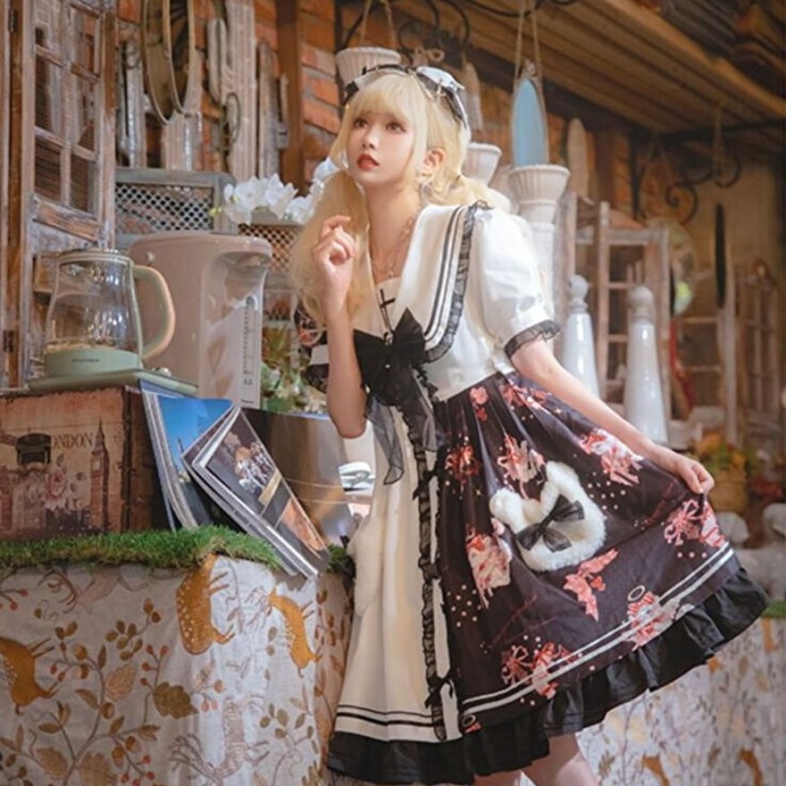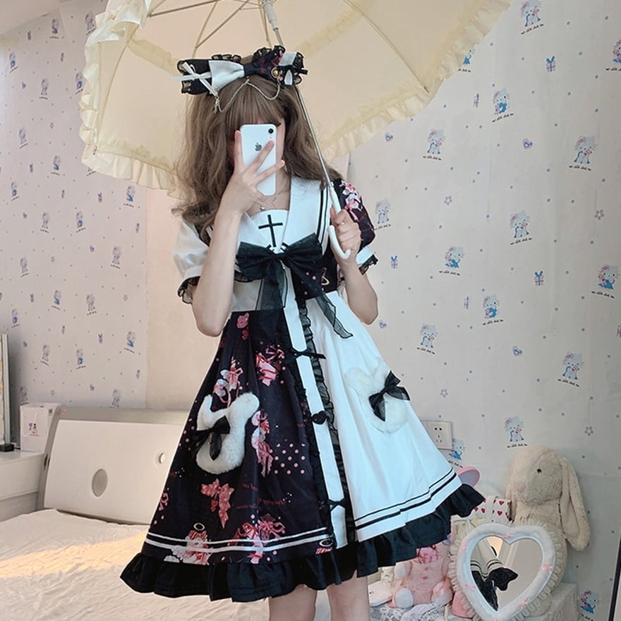 サブカル 服 地雷系 通販 ロリータワンピ アイドル ストロベリー ベア くまちゃんプリント 甘め リボン 十字架 コンカフェ イベント衣装