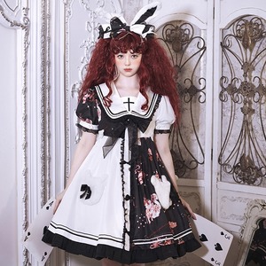 トップスはセーラー風の襟カラーに十字架、スカートは左右アシンメトリーなゴスロリ風の個性的ワンピです