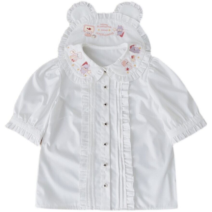 後襟のクマちゃん耳がロマンティックなクマちゃん刺繍の半袖ブラウスです