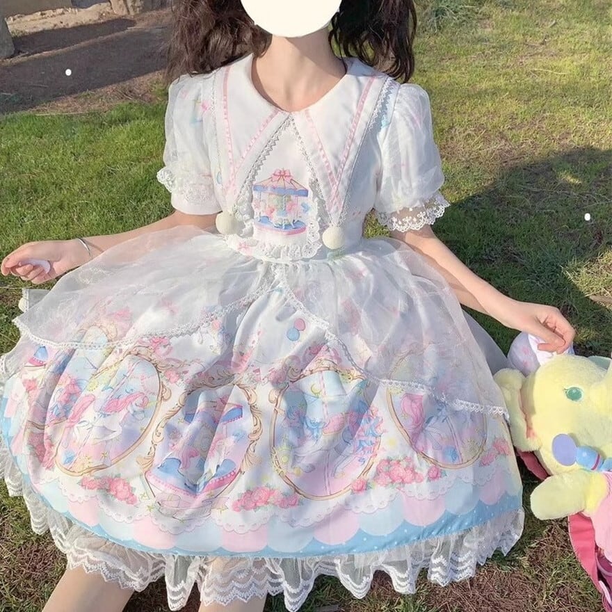 サブカル 服 地雷系 通販 スイートロリータ ワンピ キャンディカラー メリーゴーランド レース フリル ガーリー 甘め量産型