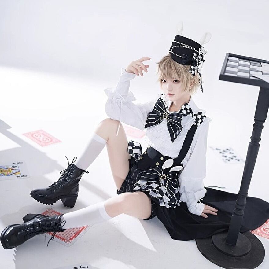 セット内訳はウエストガードル、ブラウス、パンツ、バックリボン、ストライプ柄ネックリボン、うさ耳ブローチ、リボン(市松または水玉リボン)の計7点です。