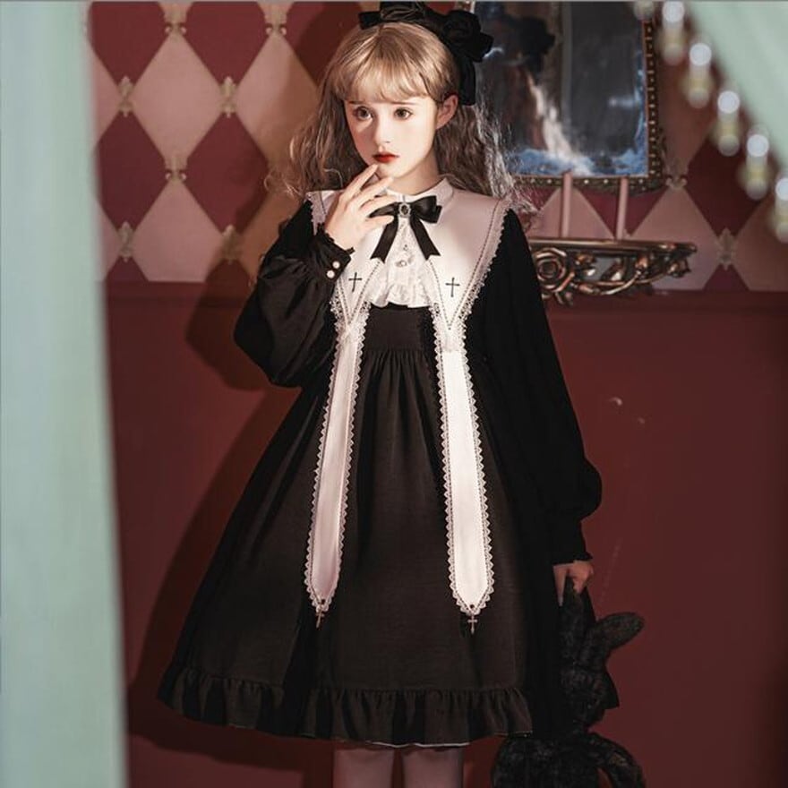 サブカル 服 地雷系 通販 ゴスロリ ワンピース つけ襟付き 修道女 シスター 十字架 刺繍 レトロ ロリィタ イベント衣装 ガーリー 甘め かわいい