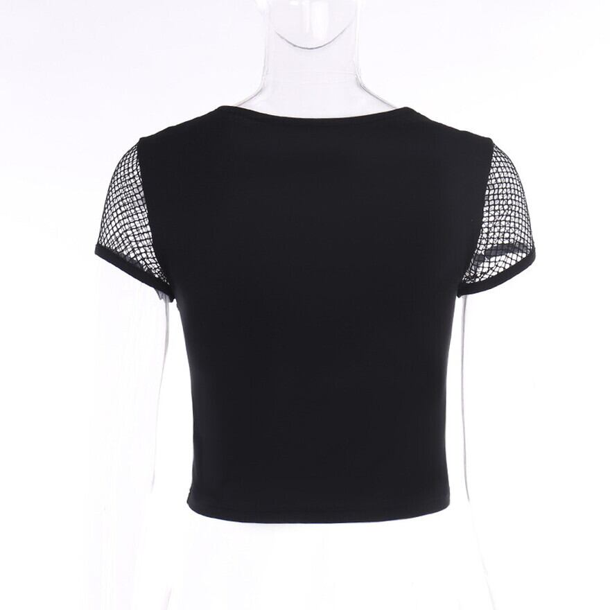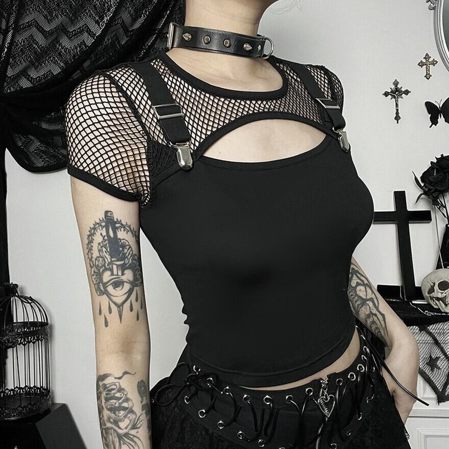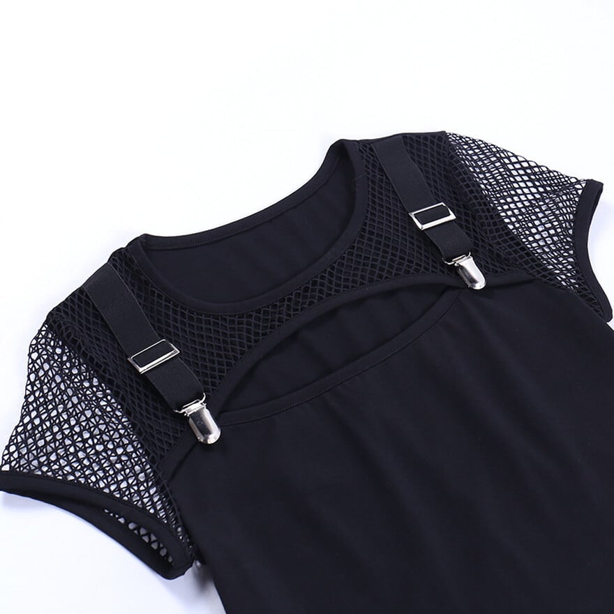 ハードゴシックなメッシュの透け感にサスペンダーベルト、穴あきデコルテが病み可愛い半袖シャツです。