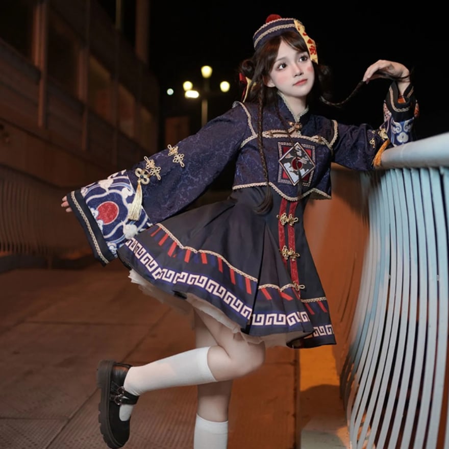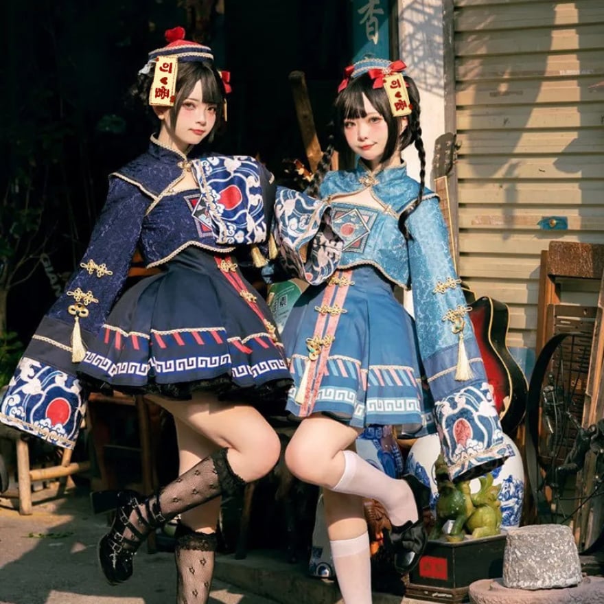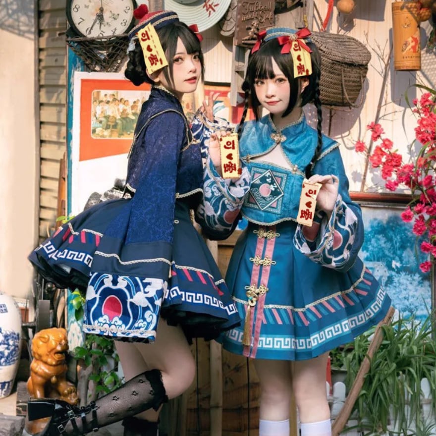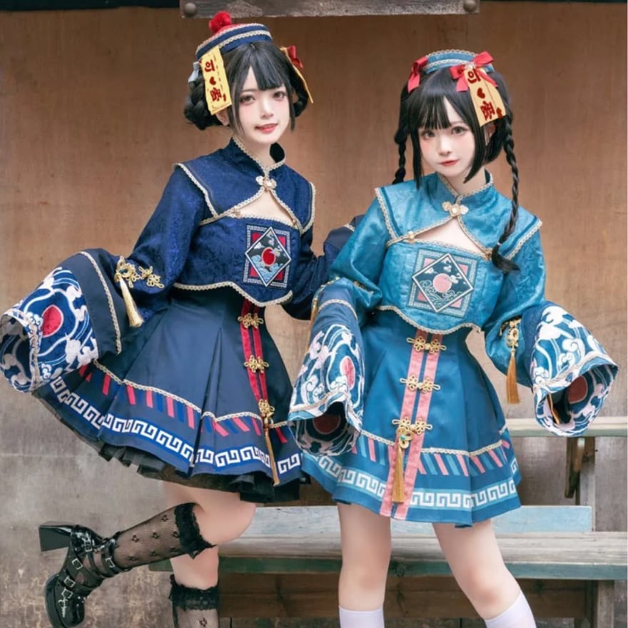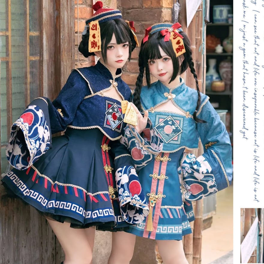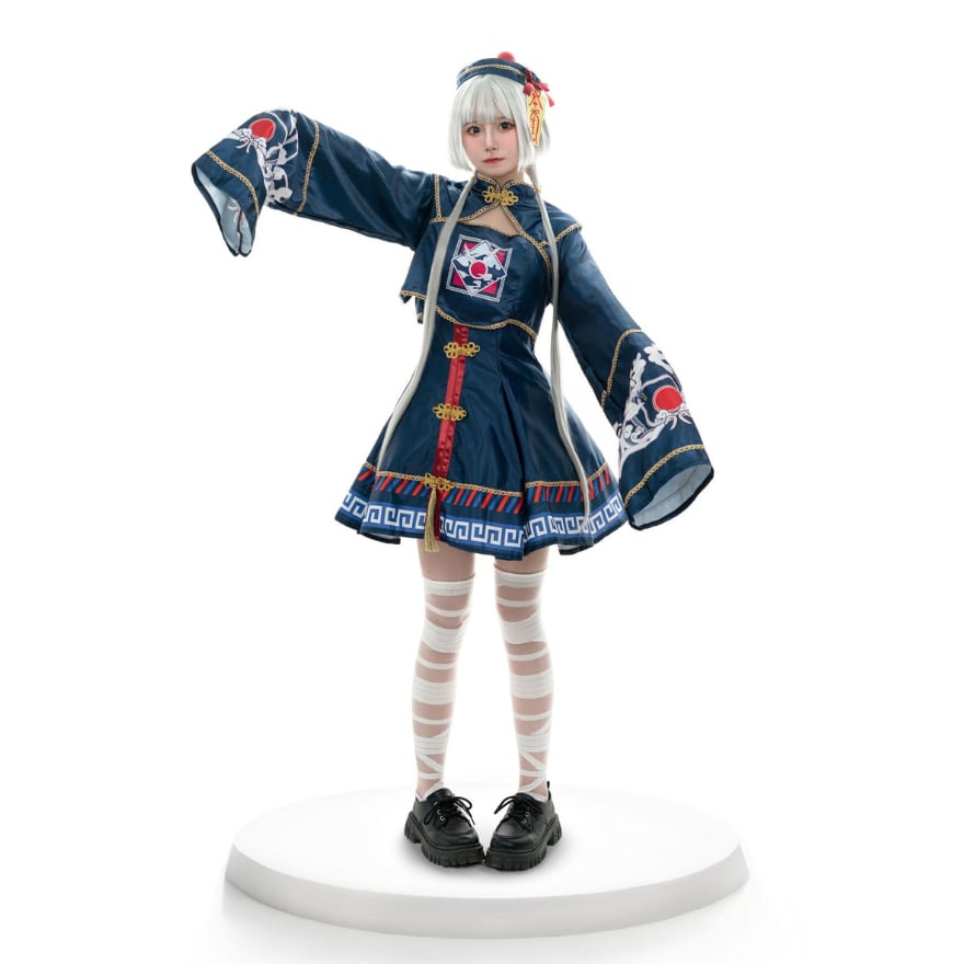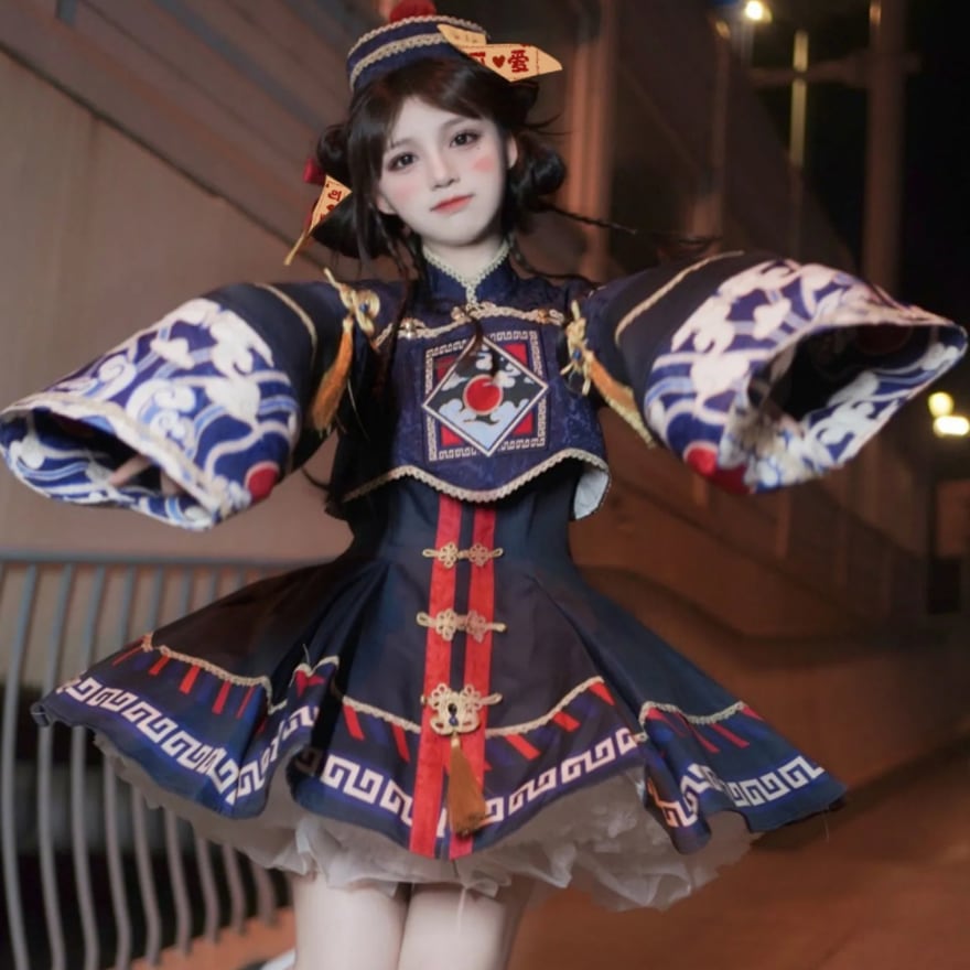 トランペットスリーブとプリーツスカートが女性らしい印象を与える一方、キョンシーを彷彿とさせるデザインにはゆめかわな装飾が施されており、かわいらしさと不思議さを併せ持っています。