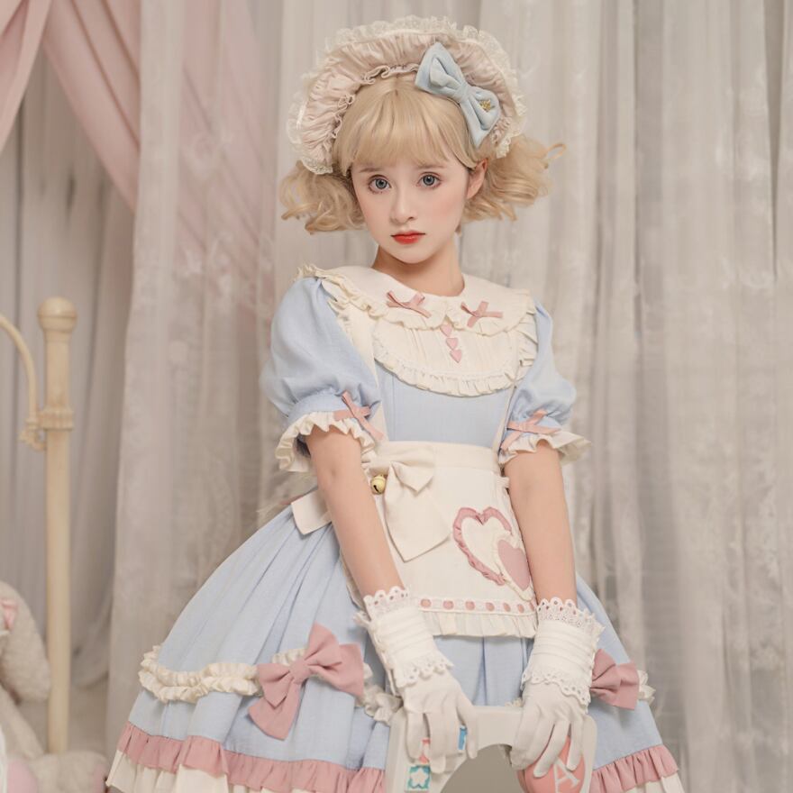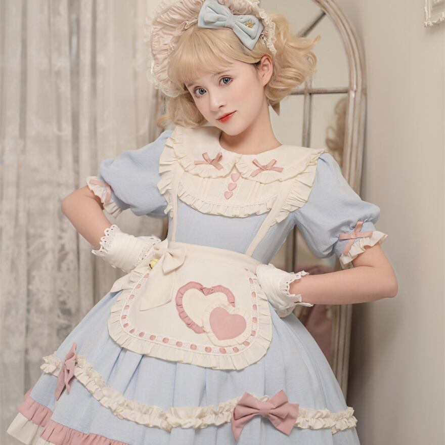 リボンにハートのエプロンがかわいいスイートロリータのメイドワンピースです。