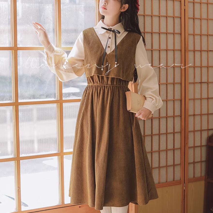 クラシカルな控えめスタイルのコーデュロイ生地のワンピースです