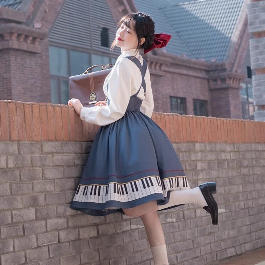 サブカル 服 地雷系 通販クラロリ ジャンパースカート ネックリボン付属 制服 女学生風 刺繍 音符 ピアノ かわいい ガーリー 甘め量産型 ろりぃた ロリィタ 服