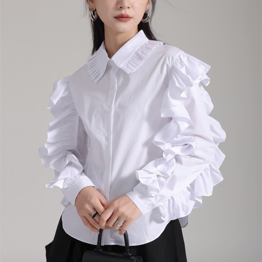 スリーブのフリルが大人かわいい個性的なデザインシャツです