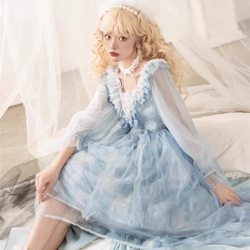 サブカル 服 地雷系 通販 ゴスロリ ワンピース 長袖 双子コーデ 水色ろりーた ゴシック量産型