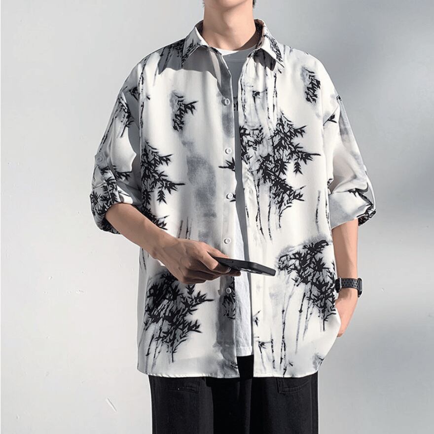 レトロクラシカルな水墨画風プリント柄のメンズ長袖シャツです。