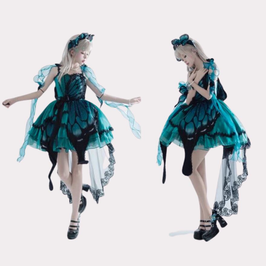セット内訳はジャンパースカート、ケープ、アシンメトリースカートカバー、butterflyフェザー、カチューシャ、チェーンアクセサリー、butterflyリボンになります。