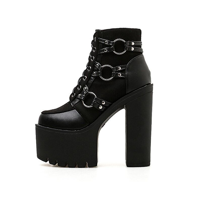サブカル 服 地雷系 通販 即納アイテム 超厚底 ショートブーツ 編上げ Oリング 闇かわいい プラットフォーム 軽量 ゴスロリ系 ハード ヒール15cm つま先高6cm