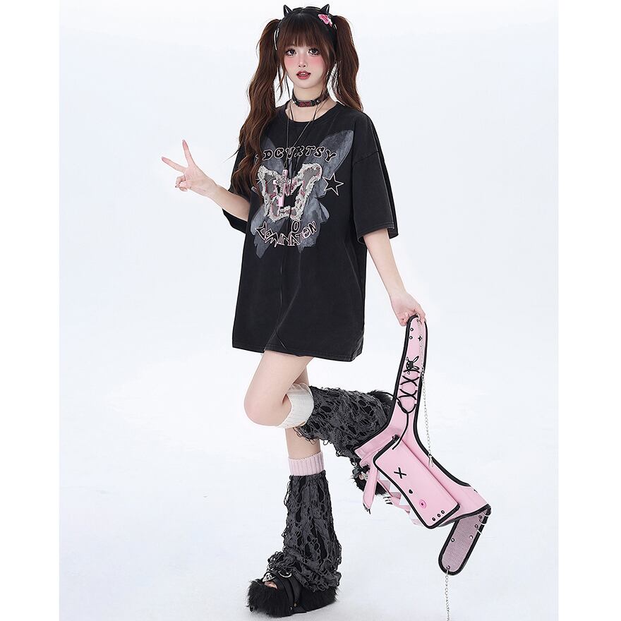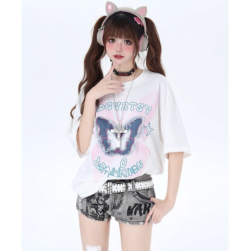 サブカル 服 地雷系 通販 CRAZYGIRL 半袖Tシャツ バタフライプリント クルーネック ルーズ 闇かわいい バンギャ