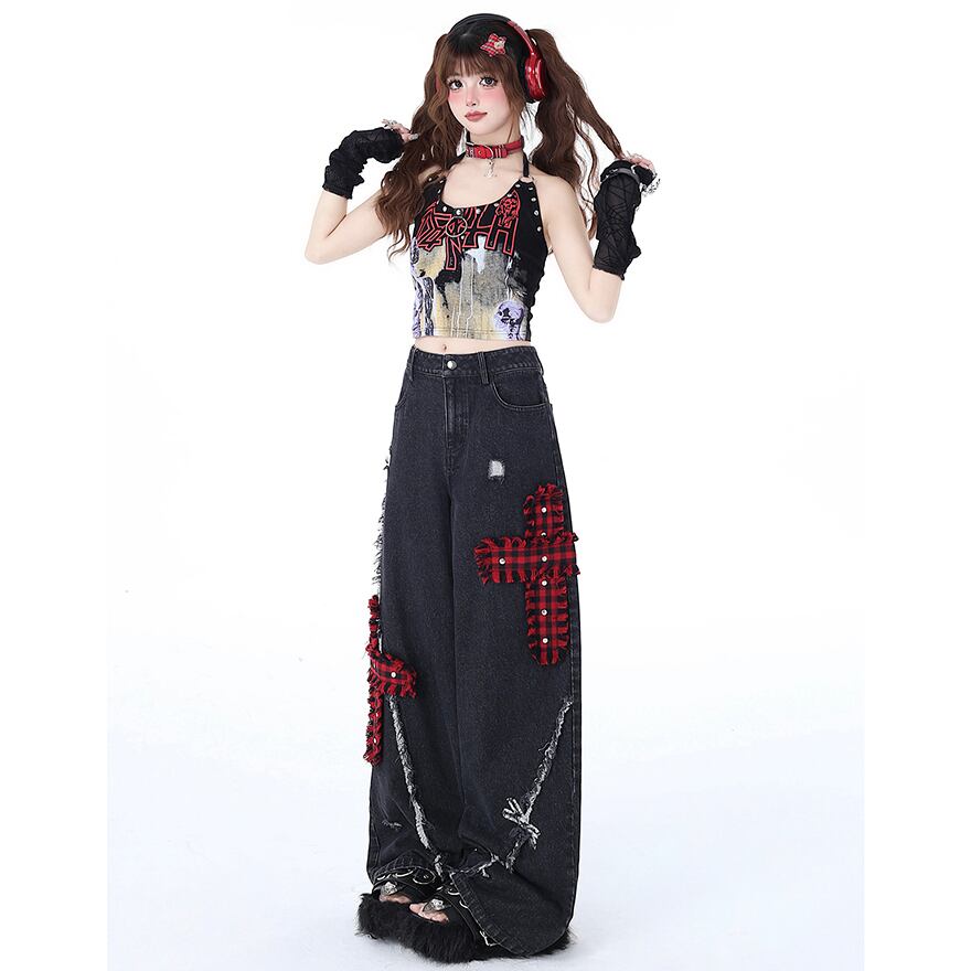サブカル 服 地雷系 通販 CRAZYGIRL ワイドパンツ ワイドデニム ジーンズ 十字架パッチ ダメージ加工 闇かわいい バンギャ