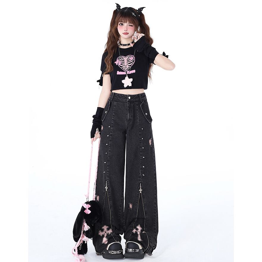 サブカル 服 地雷系 通販 CRAZYGIRL ワイドデニム ワイドパンツ スタッズ ジッパー 十字架 ハイウエスト 闇かわいい バンギャ