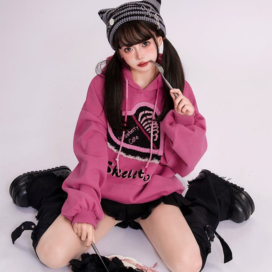 チョコレートケーキの立体刺繍が入った、ゆったり長め丈のフード付きスウェットです。