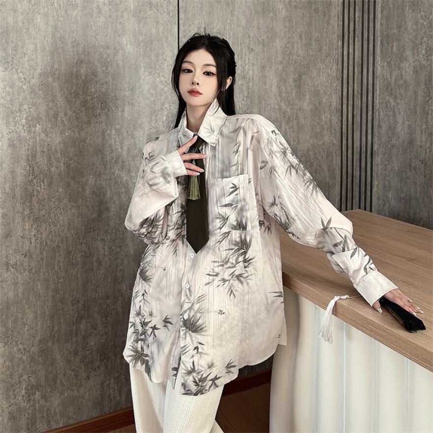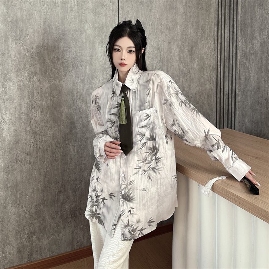 ネクタイ+タッセルがポイントの水墨画風長袖シャツです。