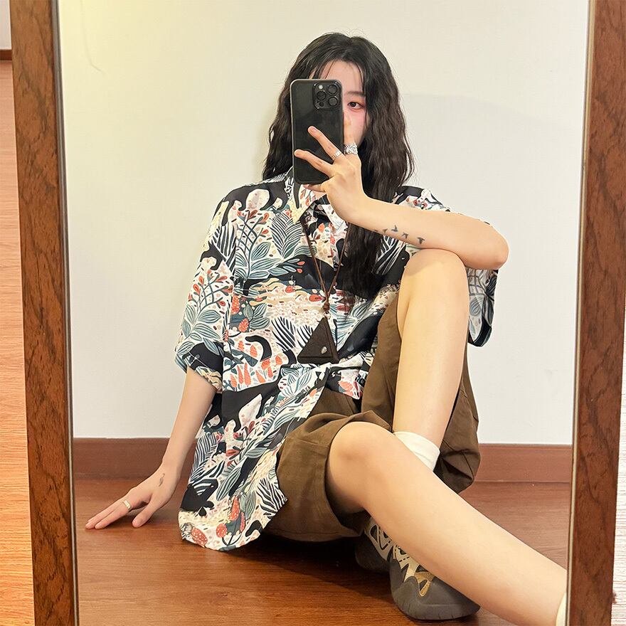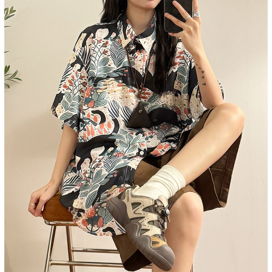 サブカル 服 地雷系 通販 Tシャツ 半袖シャツ アメリカンレトロ 総柄 手書き風 猫 闇かわいい