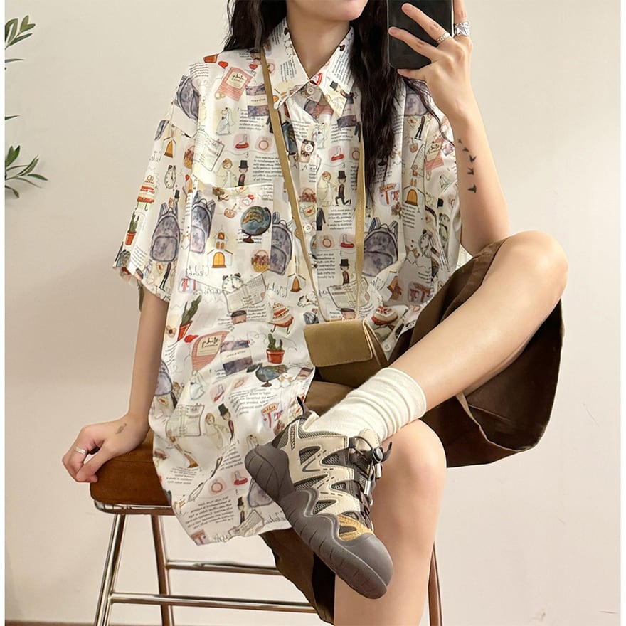 雑貨などの手書き風プリントがお洒落な総柄シャツです。