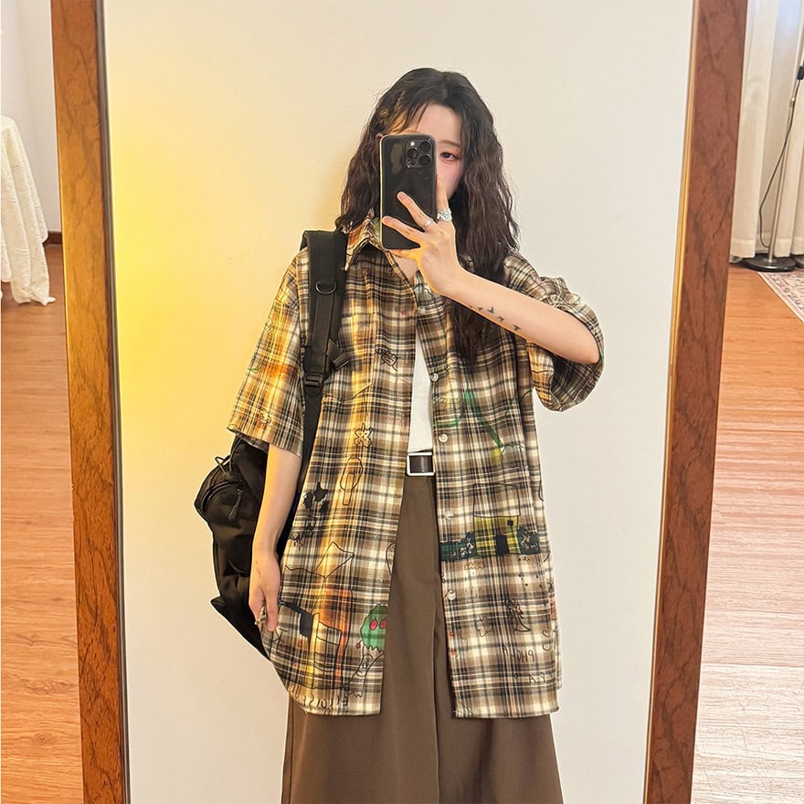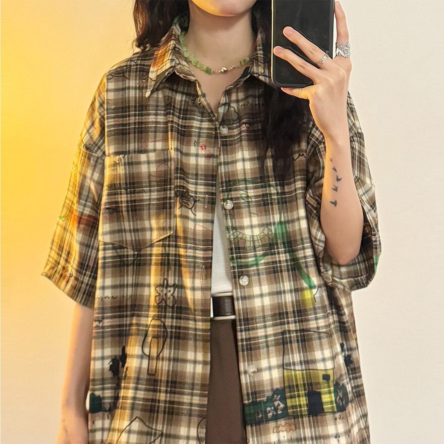 サブカル 服 地雷系 通販 Tシャツ 半袖シャツ チェック柄 落書き風プリント 闇かわいい