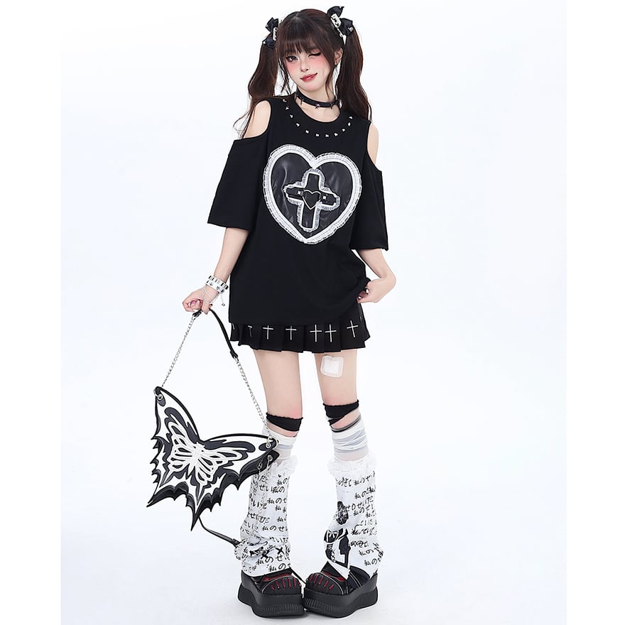 サブカル 服 地雷系 通販 在庫限り Tシャツ オープンショルダー 半袖カットソー ハート 十字架 闇かわいい