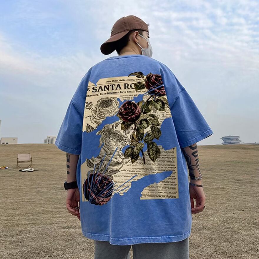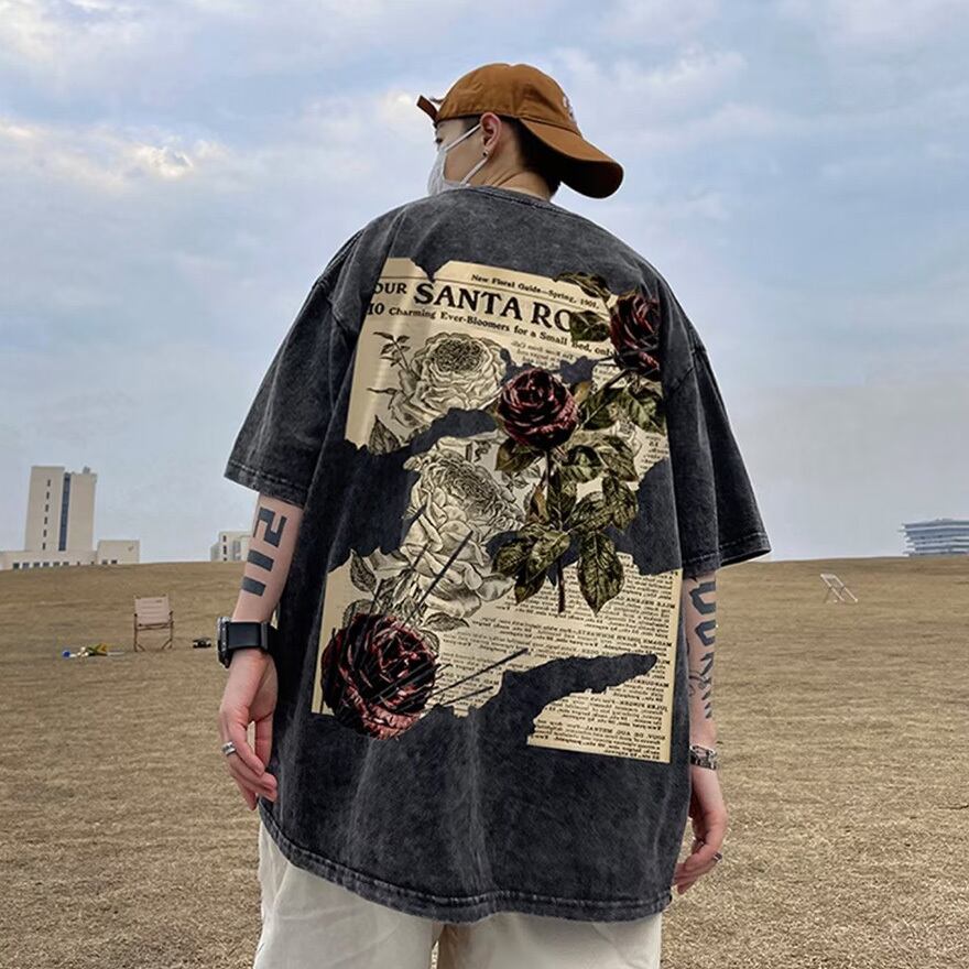 サブカル 服 地雷系 通販 半袖Tシャツ ヴィンテージローズプリント ルーズ オーバーサイズ バックプリント 闇かわいい
