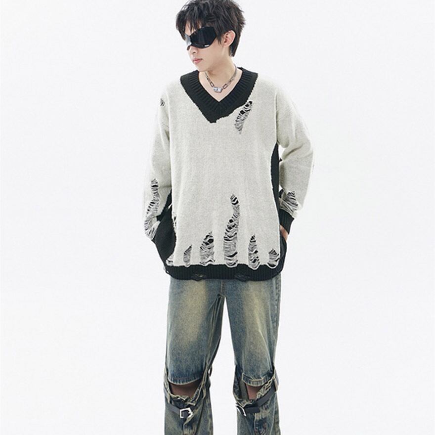 サブカル 服 地雷系 通販 長袖ニット セーター ダメージ加工 Vネック 闇かわいい
