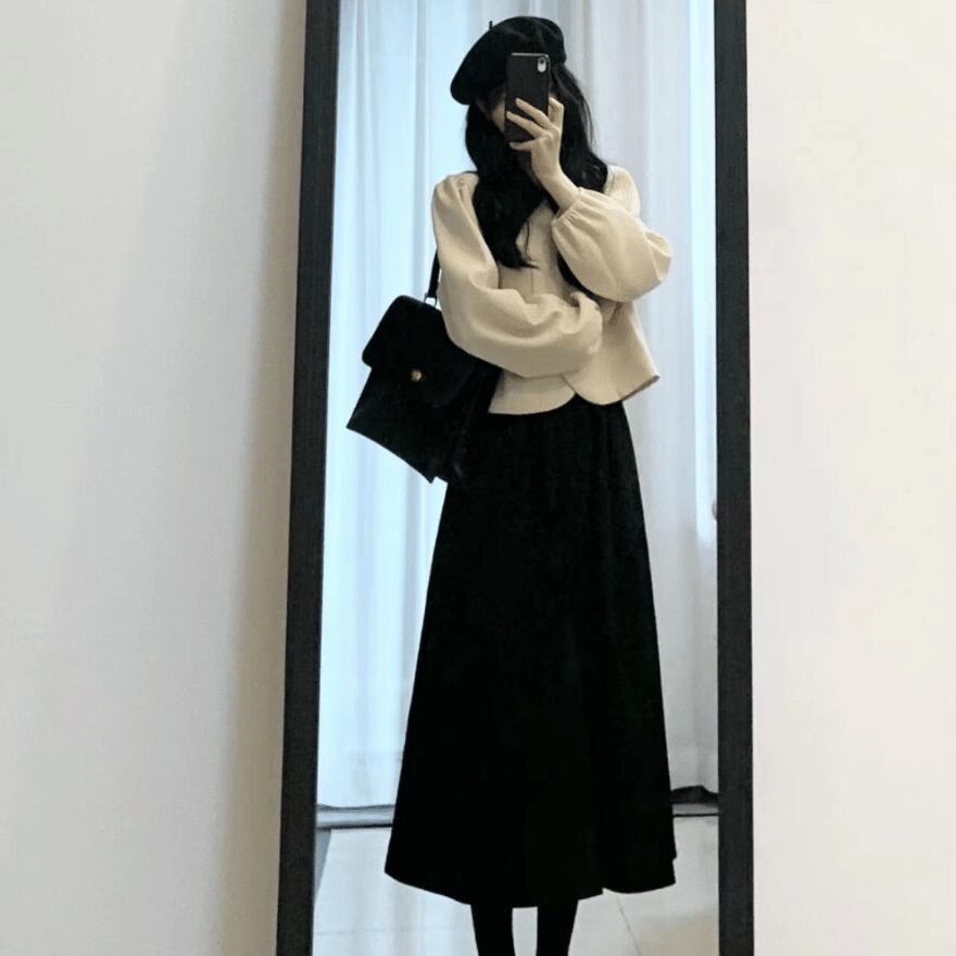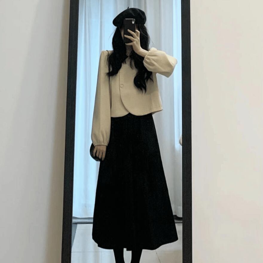 かわいい系とクール系のギャップが魅力のジャケットとフレアスカートのセットです。