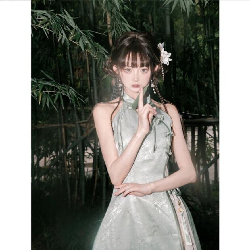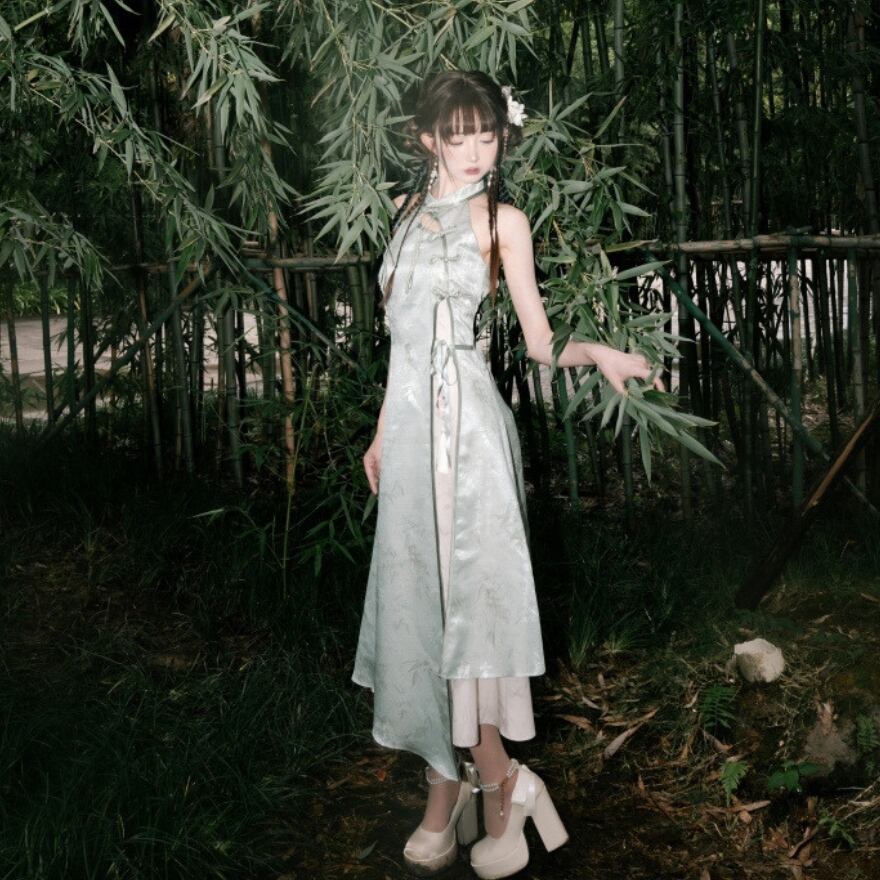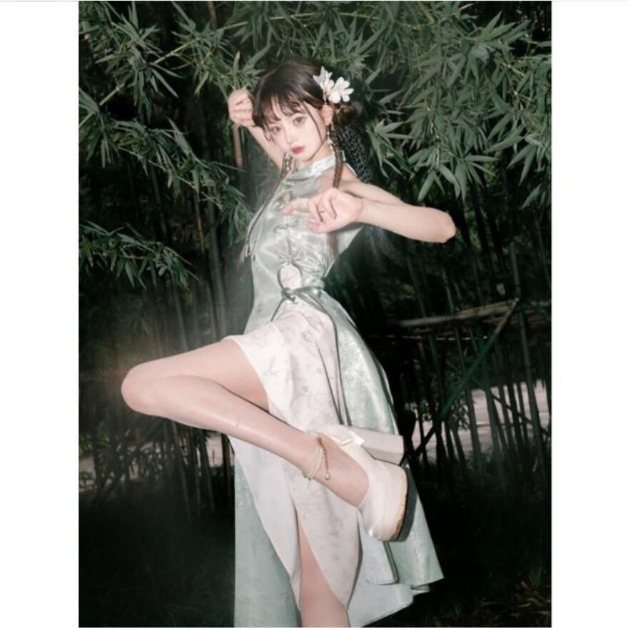 レトロクラシカルな竹をモチーフに高見えな光沢感のあるチャイナドレスとロングカーディガンのセットアップです